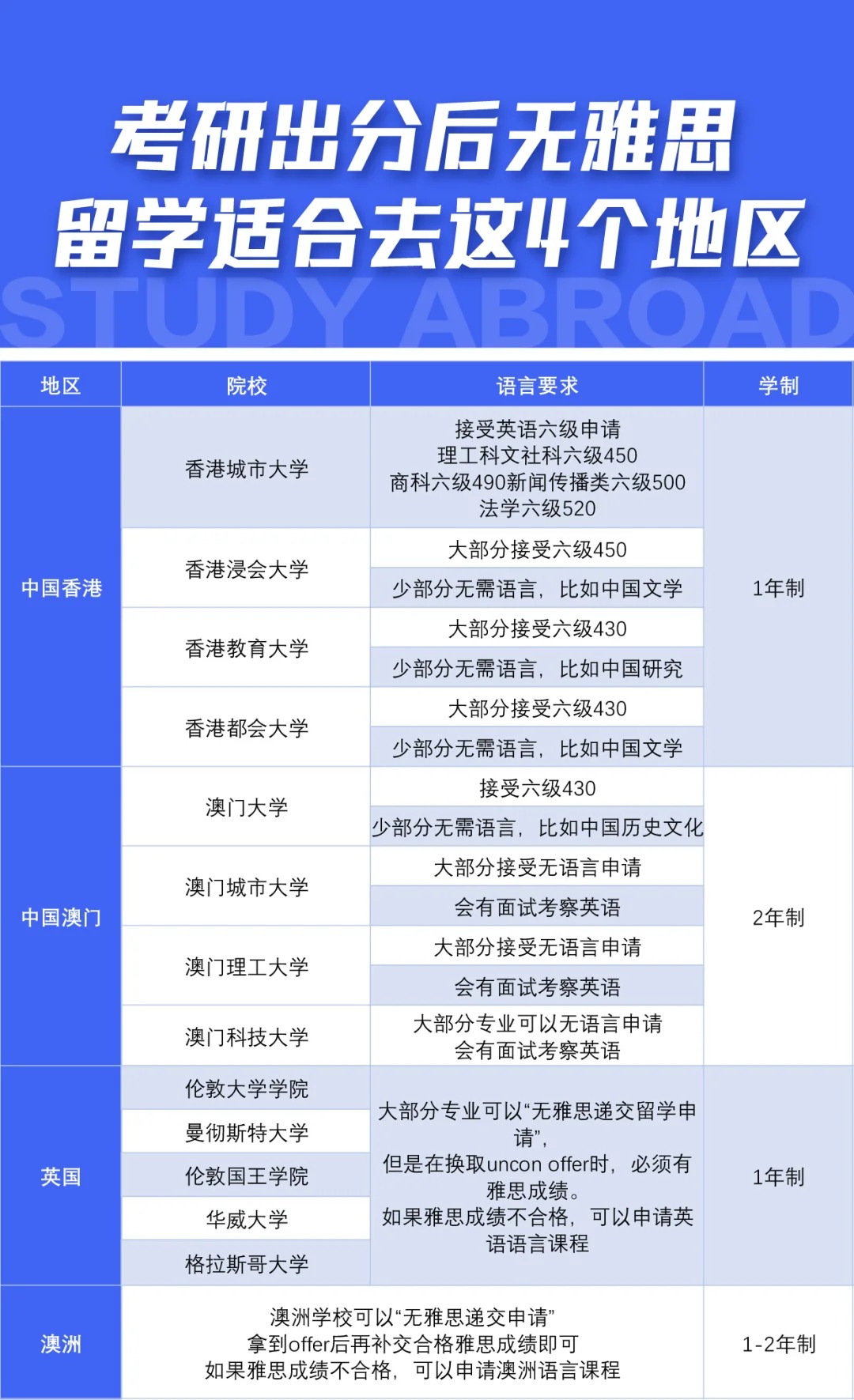 🎓考研出分后想留学无雅思?看看这四个地区❗️ 👉考研成绩出来后,很多同学可能会面临没有雅思成绩的情况🥺。别担心,今天我就来给大家介绍四个不需要雅思成绩也能申请留学的地区🎉 🌍英国 英国的很多大学都提供有条件录取📚,可以先拿到录取后,再补交雅思成绩💯!甚至还有很多学校支持配语言课,从而降低语言要求入读😎。 🌍澳洲 澳洲的大学大多提供有条件录取,先录取再补交语言🤗。 🌍新西兰 新西兰的部分学校可以接受无雅思申请,学生可以先拿到有条件录取通知书,然后在规定时间内补交雅思成绩或参加学校的语言课程🎓。 🌍香港 香港的一些大学也可以接受无雅思申请,但需要在申请时提供其他英语能力证明,如六级成绩等📄。 🙌总结一下,如果你考研后想留学但没有雅思成绩,可以考虑以上四个地区🤩。