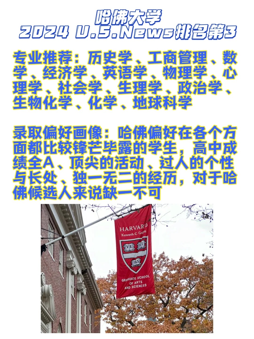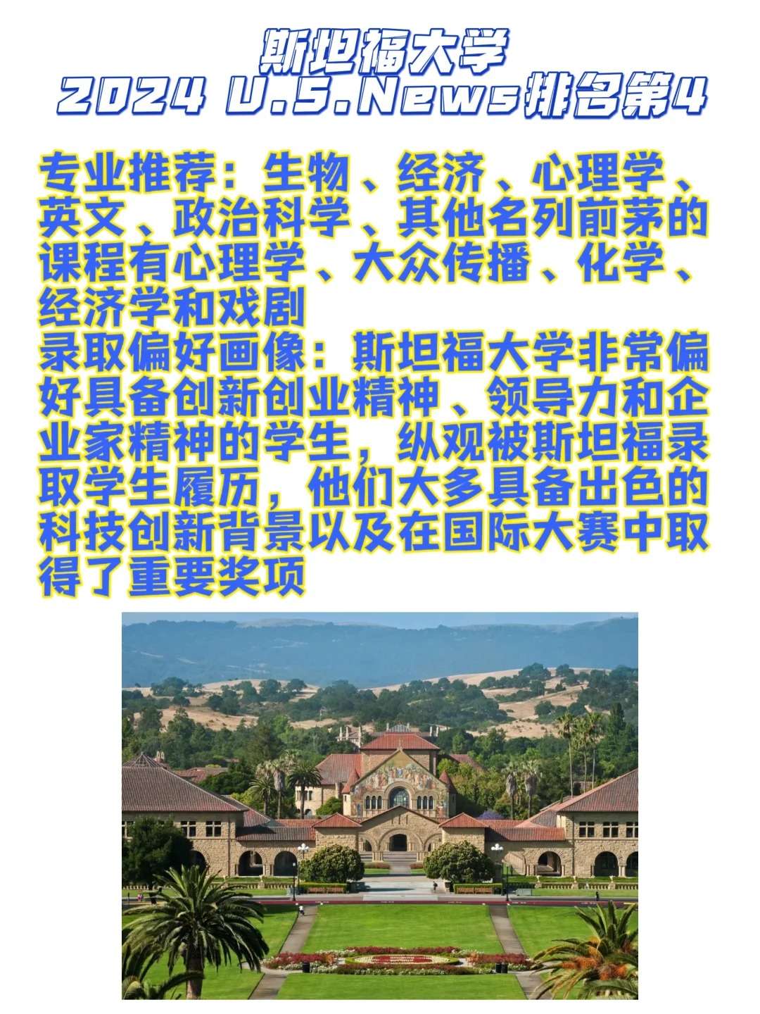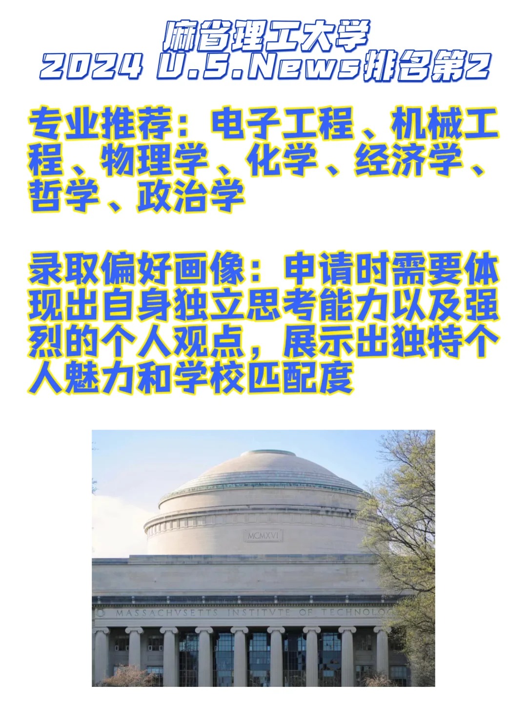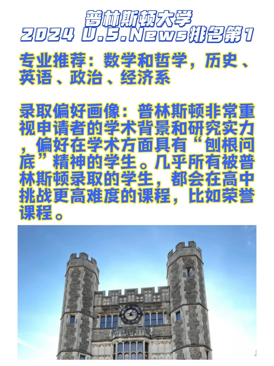 美国前5是每一个都是无数人心驰神往的学校🥹🫶具体各学校有哪些申请要求以及申请偏好大家是不是还没有清晰的了解?! 看看这篇介绍就能来判断自己适合哪一个学校🏫! 1⃣️普林斯顿大学 普林斯顿非常重视申请者的学术背景和研究实力,偏好在学术方面具有“刨根问底”精神的学生。几乎所有被普林斯顿录取的学生,都会在高中挑战更高难度的课程,比如荣誉课程。 2⃣️麻省理工大学 MIT整体上来说还是非常“分控”,2027届新生成绩中位数SAT 1520-1580,ACT 34-36,标化成绩有短板很容易被拒。此外,竞赛能力或学术活动要在全国顶尖,并且其他方面无短板。 3⃣️哈佛大学 哈佛偏好在各个方面都比较锋芒毕露的学生,高中成绩全A、顶尖的活动、过人的个性与长处、独一无二的经历,对于哈佛候选人来说缺一不可。理想的哈佛候选人通常会选择最严格的高中课程,哈佛也希望在申请中看到领导力、创新能力、克服逆境的能力、社区贡献和社会影响力、艺术特长等成绩单以外的个人特质。 4⃣️斯坦福大学 斯坦福大学2027届新生情况:最终共有1705名学生选择进入斯坦福就读,其中20%是家里的初代大学生。男女生比例各占50%, 势均力敌。非常重要的是:中学成绩严谨性、班级排名、GPA成绩、标化成绩、申请文书、推荐信、课外活动、天赋/能力、性格/个人品质。 5⃣️耶鲁大学 除学术外,耶鲁还非常重视学生的求知欲、自由精神、领导力与探索精神,并且非常喜欢有政治或者关注社区的活动的学生。只要是你倾注了热情、对周围的人产生了积极影响的活动,都值得被列入申请材料中。 _ 🔴宾夕法尼亚大学🔴加州理工大学🔴杜克大学🔴约翰霍普金斯大学🔴布朗大学🔴西北大学🔴哥伦比亚大学🔴康奈尔大学🔴芝加哥大学🔴加州大学伯克利分校🔴加州大学洛杉矶分校…这些有没有你的梦校❗️这些的申请要求会各不相同,总有一个能圆你的美本梦🫶😉欢迎来私信咨询了解详细要求哦🙋#留学美国 #留学