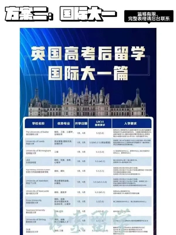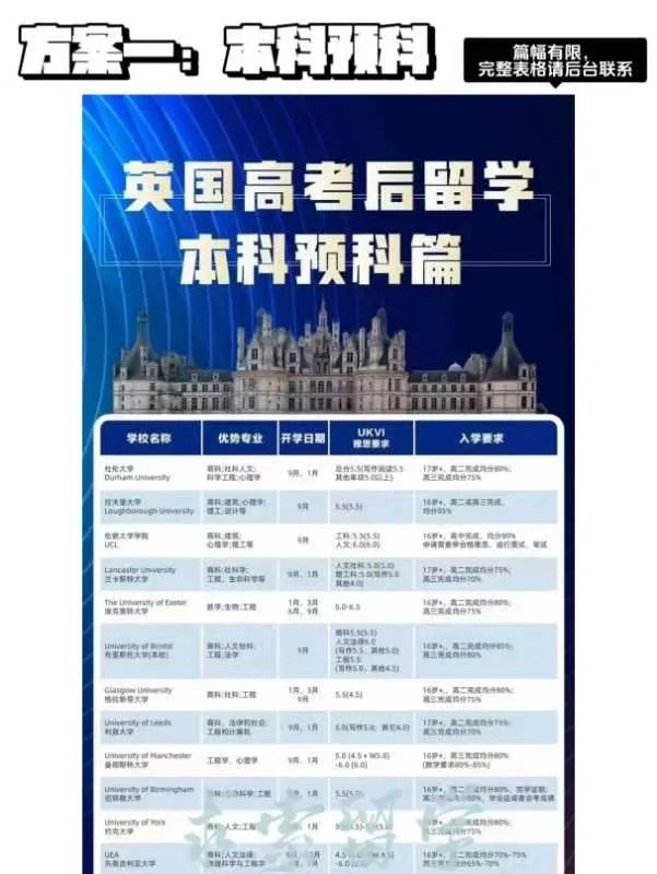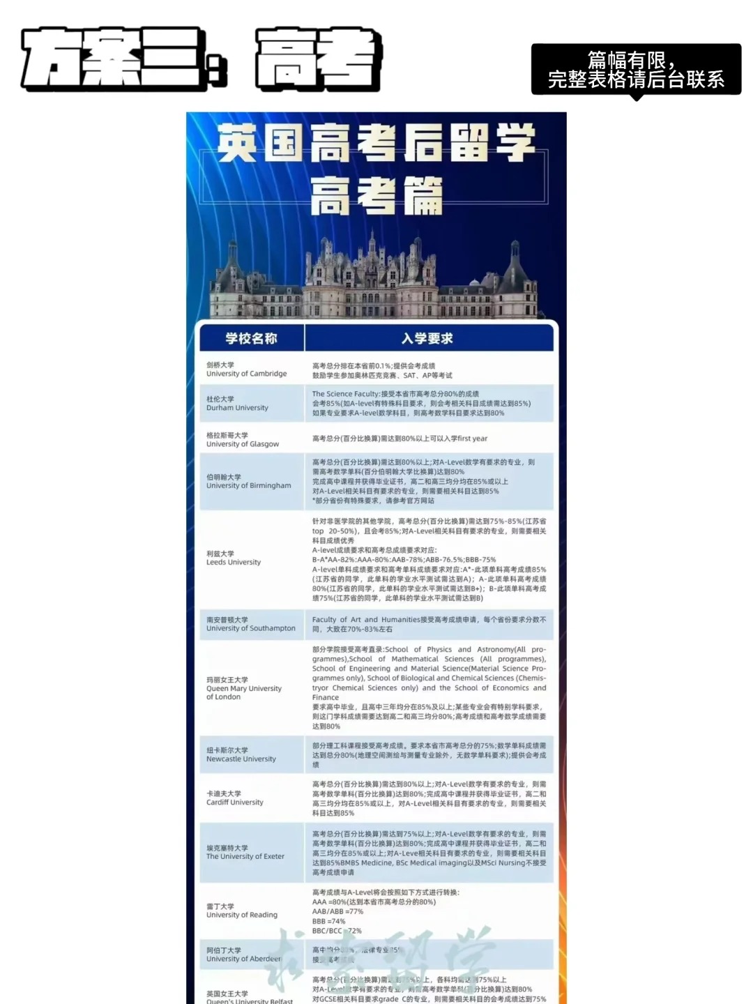 想要考虑高考后英国留学的同学看到这篇就太赚啦😭 高考后英国留学方案汇总⬇️ 1⃣本科预科留学 ✅预科课程旨在为学生进入英国大学做好准备,通常持续一年,授课内容包括英语语言、学术文化和课程专业知识。 ✅预科课程会提高学生的英语水平和学术能力,同时为他们进入大学做好准备。就读预科期间,学生可以提升自己的英语能力,掌握基础的专业课知识及学习方法。 ✅预科毕业后,如果考试合格,可以申请继续就读所在的大学,也可以选择更适合自己或者更好的英国大学就读。 🌟具体的入学要求各位同学可以参考图片,需要详细了解的同学欢迎来咨询💙这种途径要求较低,但是花费可能会更高哦~ 2⃣国际大一 英国国际大一(International Year One)留学是指英国院校为不能直接入读本科的申请者而准备的课程。 ✅该课程的性质等同于英国本科的第一年,但入学要求却低于普通本科。 ✅在国际大一阶段,留学生将接受国际教育,与来自世界各地的学生一起学习,体验异国文化,提高自己的语言能力和学术水平。 🌟国际大一主要针对的人群包括:年满18周岁、雅思成绩5.5+、国内高三毕业的学生。具体各学校的要求参考图片啦🤗 3⃣高考留学 目前,英国有55所高校✅可接受高考成绩直申本科,包括剑桥大学、格拉斯哥大学、伯明翰大学、南安普顿大学、利兹大学等。 注意❗️这些大学对高考成绩有一定的要求‼️请各位同学参考表格信息或者来咨询了解哦💙 - 申请英国🇬🇧留学对于高考生来说无疑是一种双保险的选择,如果同学们有疑问或者留学想法都欢迎来交流沟通